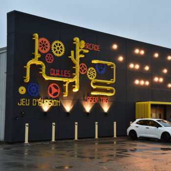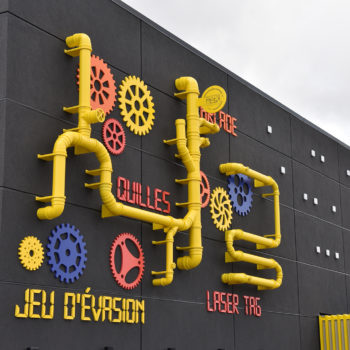 In 2023, Réflecteur collaborated with Construction YMC to create a large-scale wall sign for Centre Mega. Combining creativity, technology, and precision, this outdoor signage transforms the building’s facade into a truly immersive scene. Through a dynamic three-dimensional composition and the thoughtful integration of piping and gears, the sign instantly captures attention. This custom project, a finalist at the 2023 AQIE Awards in the “Unique Signs” category, reflects Reflecteur’s commitment to creating impactful, distinctive, and aesthetic installations that extend the customer experience beyond the building itself. Every detail of this project reflects the playful and innovative spirit of Centre Mega.