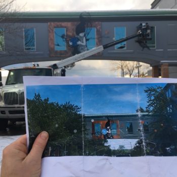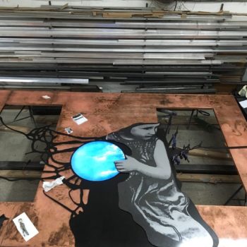 The lettering covering parts of the artwork was digitally printed on clear adhesive vinyl, allowing the underlying materials to remain visible. This technique ensures high precision in the visual motifs and long-lasting graphics, thanks to the UV-protective film. In addition to industrial materials, the work includes a round illuminated box that casts a soft and calming light. This subtle use of materials allows the piece to blend into its surroundings while maintaining a majestic and timeless presence.