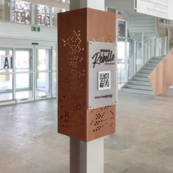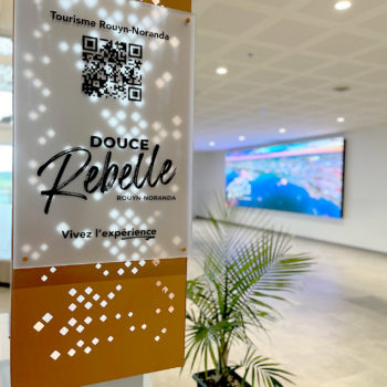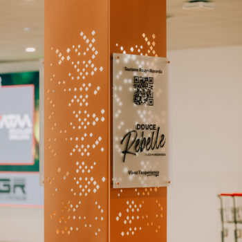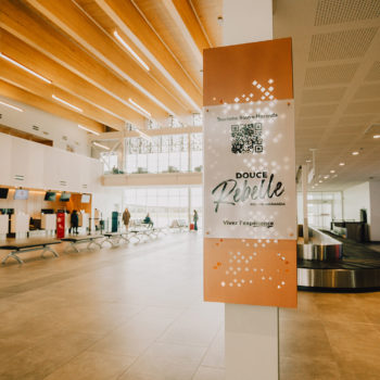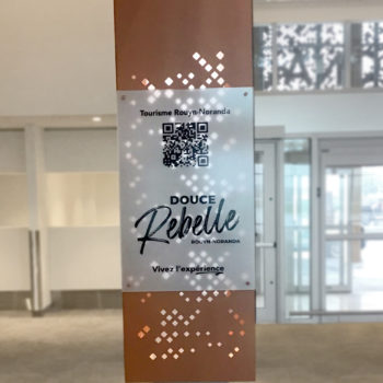 Inspired by an existing pylon sign, this new column includes a QR code directing travelers to the Douce Rebel tourism website—an initiative to encourage discovery of the city from the moment of arrival. The column’s minimalist and elegant design fits within a contemporary setting while staying true to the spirit of the city. Signage elements include painted aluminum, 12 mm acrylic letters and logos, and 3M frosted vinyl, adding subtle texture and a refined finish.