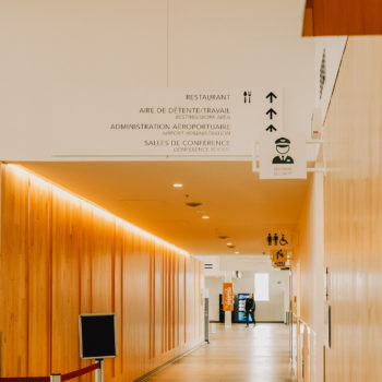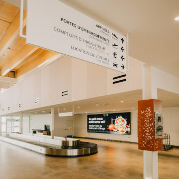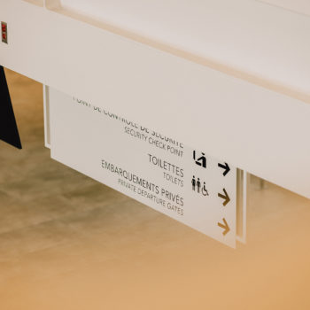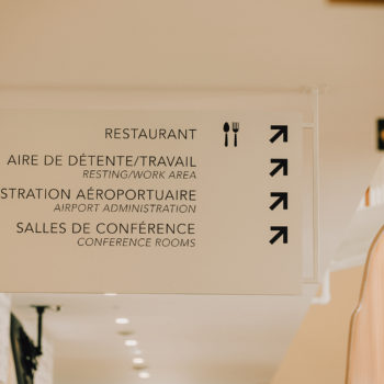 The interior wayfinding signage of the new Rouyn-Noranda Regional Airport stands out for its minimalist and functional design. Created to offer a smooth and intuitive experience, the project integrates discreet signage with the airport’s modern and open style. The primary objective was to facilitate passenger movement while ensuring the signage blended harmoniously with the building’s contemporary architecture.