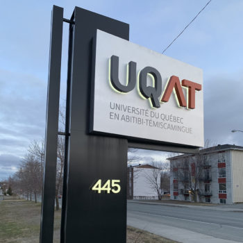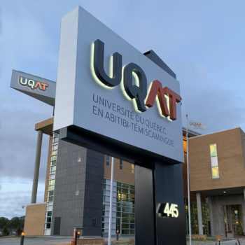 The modernization of UQAT’s pylon sign began with the restoration of the existing structure. It was covered in a black aluminum cladding, giving it a contemporary and elegant appearance. The street number was designed using the “Push Through” technique, where clear acrylic painted on the front protrudes from the alupanel, allowing light to diffuse from the sides of the digits.